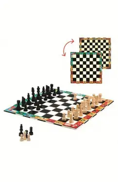 Un estuche que contiene un tablero de ajedrez y un tablero de damas con piezas de madera y un folleto introductorio.2 juegos clásicos imprescindibles en 1.Un atractivo estuche ilustrado para guardar y transportar los juegos.Fabricado en papel y cartón con certificación FSC®Edad: +6,99Número de jugadores: 2Tiempo de juego: 20 min ...